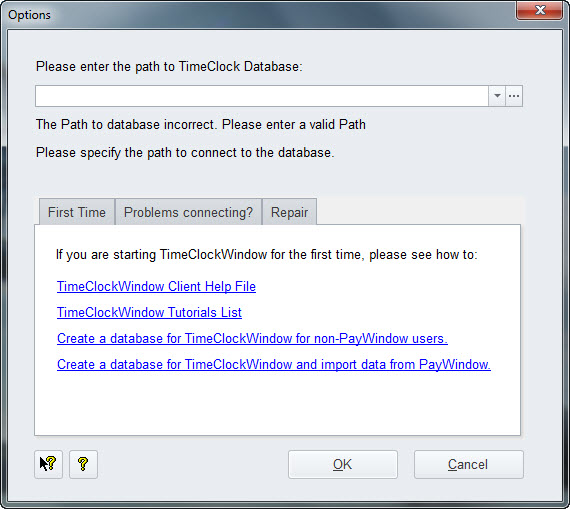 If it is the first time you are running TimeClockWindow Administrator, you will see a message like this: