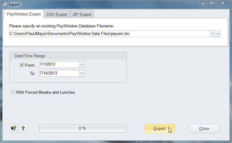 As you can see below, we know where the PayWindow database is and have automatically inserted that information for you. The next thing you want to do is to select the start date and end date for the pay period to export into PayWindow and then click on the "Export Time" button as seen below.