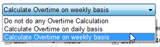 If you elect to calculate overtime, you have a choice of selecting to calculate using a daily or weekly method. You would select the choice and then enter the hours to use as the start point in item 2 shown below.