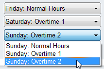 An example is if you want to pay Overtime 1 for Saturdays, check the Saturday box under Overtime 1. You would see a pick list when clicking on one of teh days like this.