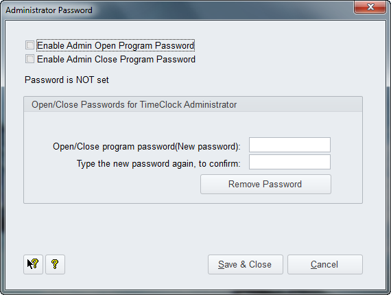 We suggest that you create a password as a minimum to enable opening the Admin program.  Use the checkboxes as seen above for your choices. After entering your password and typing it in again to conform it, click the Save & Close button.