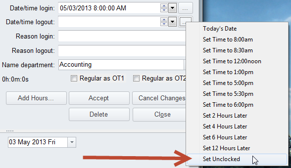 In the above example we typed in 40 hours, selected Vacation from the Department list and clicked on the "Update logout Date/Time" button to force a 40 hour perod. You can save that transaction to the list by clicking on OK and click on the Accept button to store the changes.