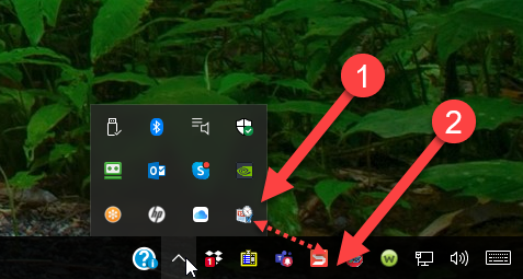 If you do not see the Tray Icon it may be hidden by Windows in the Hidden Window folder. Click the small Up Arrow (1) and it will be seen as you seen below. (2).