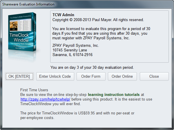 The First Time that you start up TimeClockWindow’s Administrator Tool (tcwa.exe) you will see the Shareware Reminder screen which looks like this: