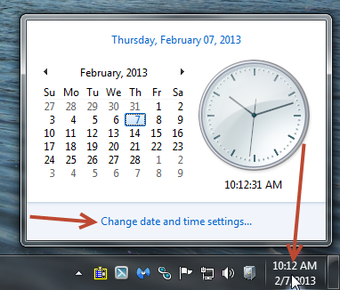 To verify that all computers are on the same time zone, click on the time / date as shown below to pop up the Time / Date Window. Then click on the "Change date and time settings..." link seen below.