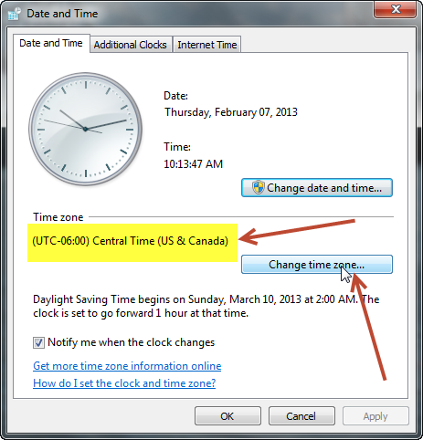 Then if the Time Zone displayed (highlighted in yellow below) is not correct, click the "Change time zone..." button and select the proper time zone for your location. Do this on all computers that will be networked together with with TimeClockWindow.