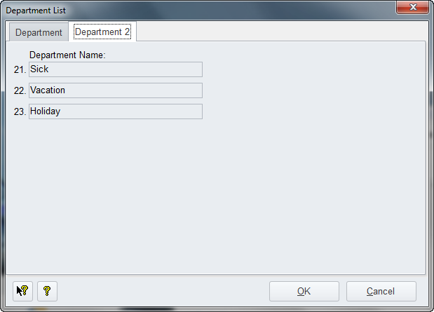 This Tab will open the page with the three default departments we use for Sick Pay, Vacation Pay and Holiday pay hours as shown below: