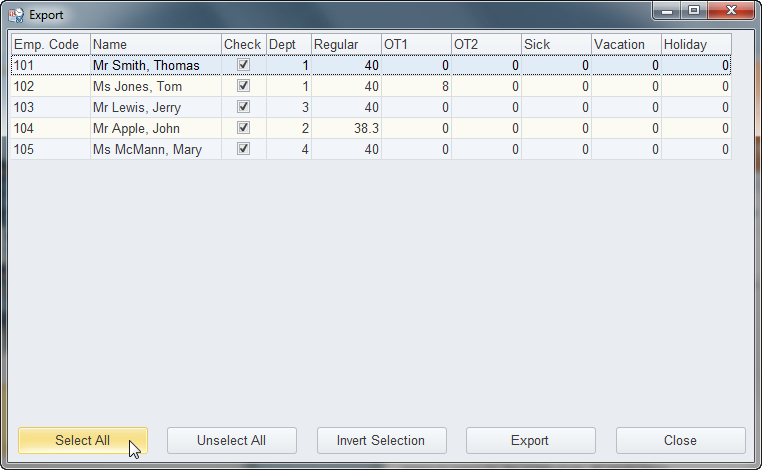 That will open a window with a list of payroll transaction to export to PayWindow. Use the "Select All" button to select all employees and then click on the "Export" button. That will poke the hours into PayWindow and when you go to pay them they will be waiting for you.