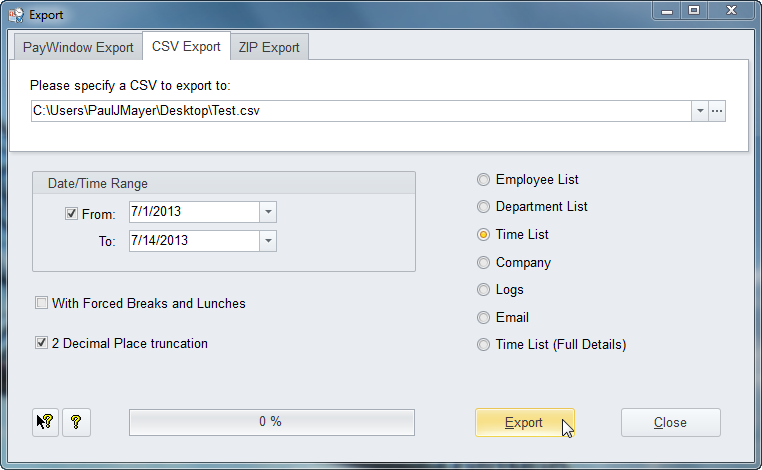 You can use the CSV Export Tab to export to a file that can be opened in Microsoft Excel or imported into software that can import from CSV files. As you can see there are a number of export options and if you have been using TimeClockWindow where we only exported the time for you, that is the option you see selected below named "Time List".