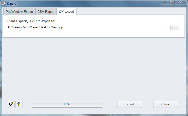 The third Tab is called "ZIP Export" and is only used to create a "backup" file that would be used to create a database system for our new TimeClockWindow Server Internet based time clock system. When setting up the new Internet based system, that file would be used by the system's Restore tool on initial setup. This is not useful for any other purpose that getting a starter set of database files for the new TimeClockWindow Server edition.