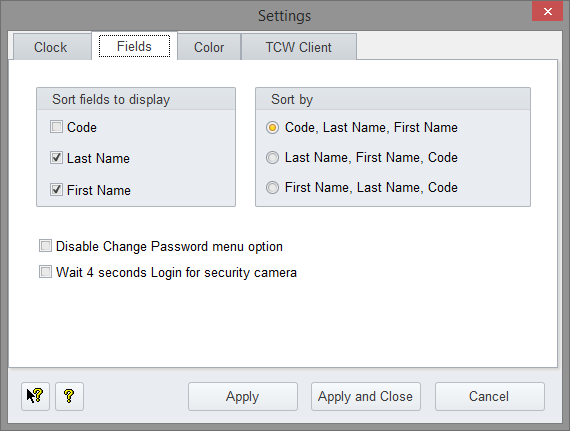 The Fields Tab sets the Employee Client's data to display, sort order and you can disable the employee's ability to change their own punch in and out password. We also have an option to add a 4 seconds delay when the employees punch in our out to allow time for any security cameras you may have to capture an image of who is punching in our out at a given time.