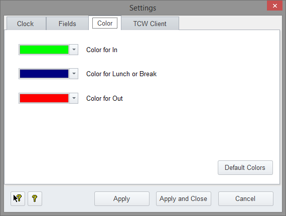 The Color Tab sets the colors used for punching in, on break and out in the employee time card display. This is for users that are color blind and you can set the colors that they can see on a particular computer.
