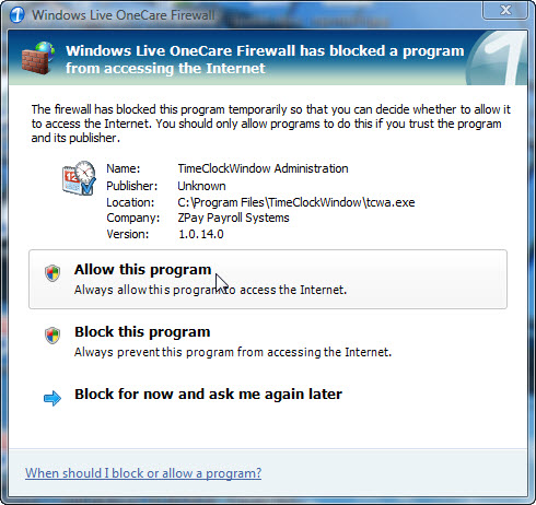 In the TCW Client page is our best security feature. If your computers are on-line, you can use this feature to get the punch time from the Internet time servers. Whenever you set up for the first time or upgrade TCW, you will need to test the time servers. If you run a new installation, and are using Vista you will see a screen like you see below which you test one of the servers for the first time. It will also pop up the first time that you run the Employee Interface with this option turned on.