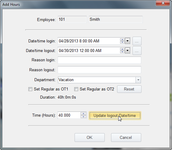 In the above example we typed in 40 hours, selected Vacation from the Department list and clicked on the "Update logout Date/Time" button to force a 40 hour perod. You can save that transaction to the list by clicking on OK and click on the Accept button to store the changes.