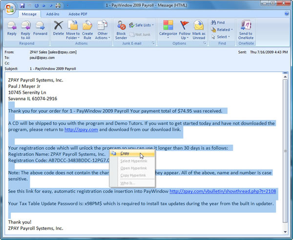 Once you have received the Registration Email from sales@zpay.com, open the email and using your left mouse button, click any place above the registration code and holding the mouse button down, drag to any spot below the code and release marking it as seen below. The with the mouse, Right Click and from the popup menu, select the Copy option as seen below.