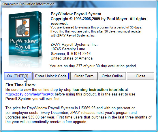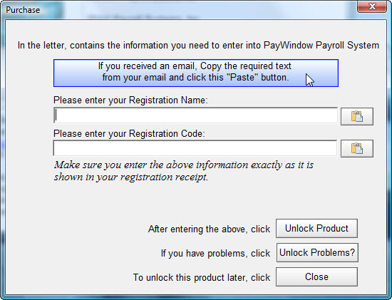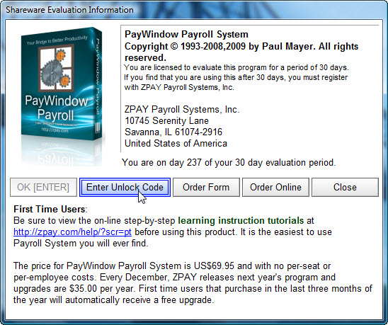 Then start TimeClockWindow or our other software and click on the Enter Unlock Code Button as seen below.