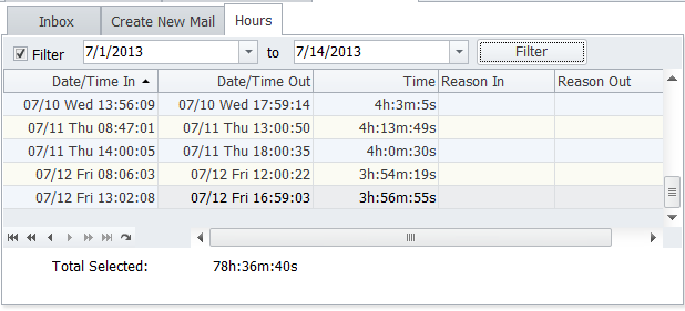 By selecting the Hours tab, the employee can view the hours recorded. They can even select a date range and use the checkbox and Filter button to get a specific range.