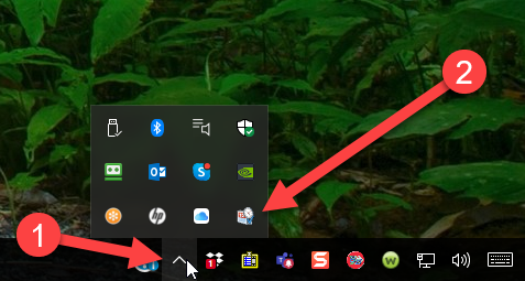 If you do not see the Tray Icon it may be hidden by Windows in the Hidden Window folder. Click the small Up Arrow (1) and it will be seen as you seen below. (2).