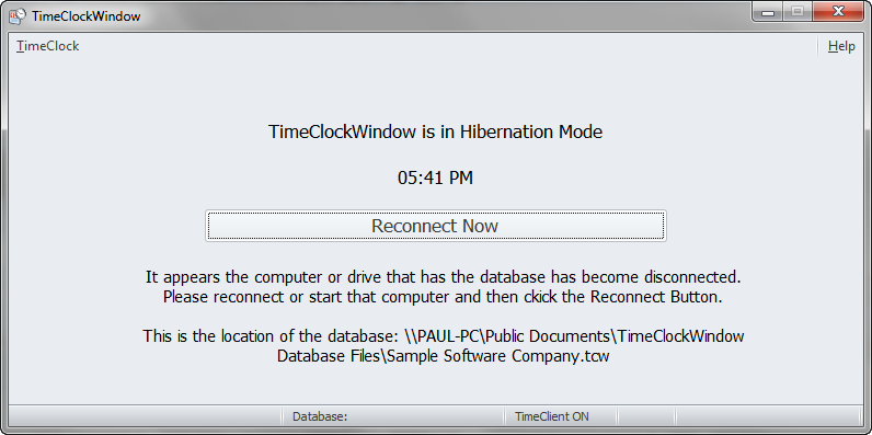 If the database cannot be contacted you will see TimeClockWindow go into Hibernate mode with a message as seen below.